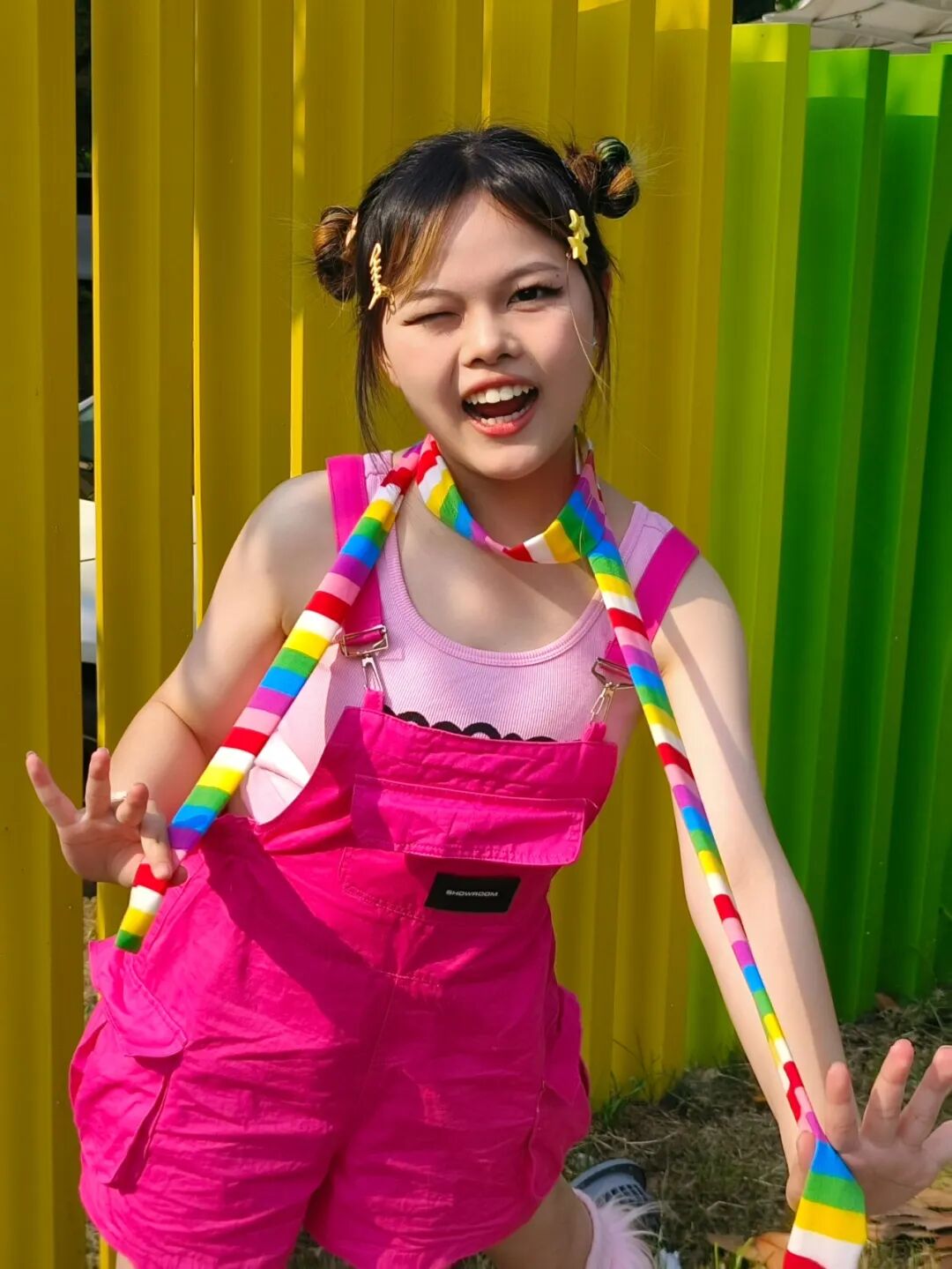 去音乐节蹦完迪,北戈把用了两年的小狗头像,换成了自己在音乐节现场的全身照。照片里,她穿着那件衣柜中唯一的亮色“辣妹装”,笑容灿烂。两周后,她又去理发店将两侧的头发挑染成了宝蓝色。直到五月底她去做美甲,美甲师看着她递来的彩色样式图,脱口而出“多巴胺”三个字时,她才发觉原来这已经成为了一种人人熟知的时尚风格。