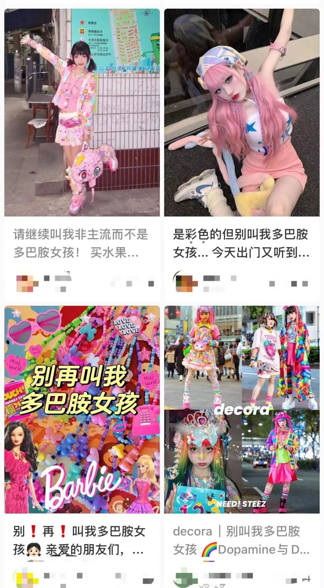 有一回,跑跑鱼穿了一身蓝绿色裙子,搭配了粉、黄、蓝相间的重色眼影,还带了一个紫色的发夹。地铁里碰到几位初中生,指着她大喊:“快看,是多巴胺!”当时,她觉得有些不舒服,但只是和朋友对视了一眼,尴尬地笑了笑,小声地抗议道:“不要叫我们多巴胺女孩。”