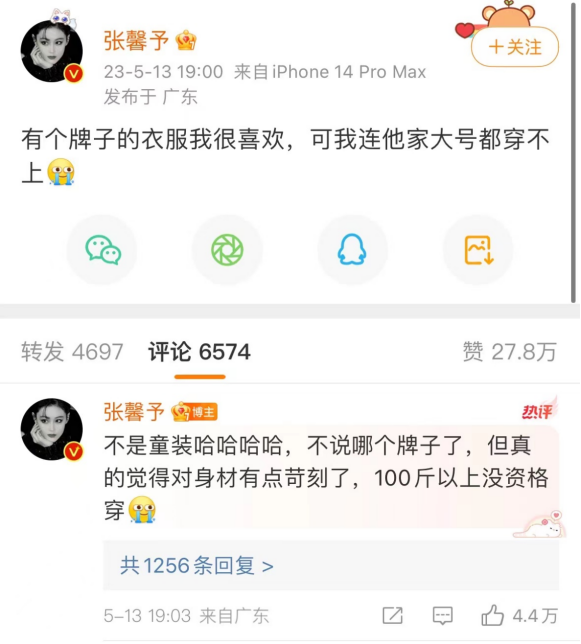 甚至连女明星也被排除在外。在《神雕侠侣》里饰演李莫愁的张馨予,一度发微博抱怨:“有个牌子的衣服我很喜欢,可我连他家大号都穿不上。”公开资料显示,她身高1.69米,体重只有51公斤。“100斤以上没资格穿。”