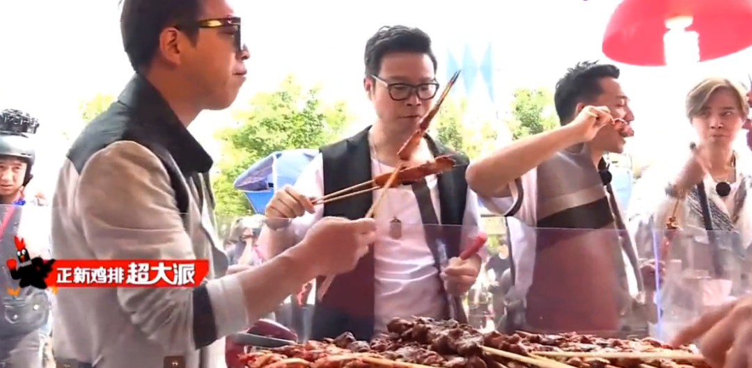 ▲ 《极限挑战》中,黄渤、黄磊等人在正新鸡排店面前吃炸鸡和烤串。图 / 《极限挑战》截图