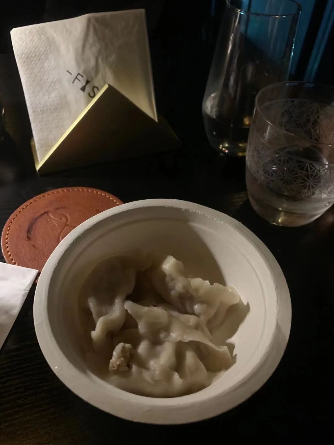 11点55,我跑到吧台去看饺子怎么样了,想拍几张照片,老板说会开香槟,我以为会整个小仪式,把香槟喷出来那种,但其实并没有,老板说那太浪费了,有酒喝就不错了。拿出香槟杯,开了两瓶,给每个客人都倒了半杯。按一个人两个饺子的分量,每桌上了一份饺子,所以我这桌,上了4个饺子,猪肉酸菜馅的,老板家里包的。