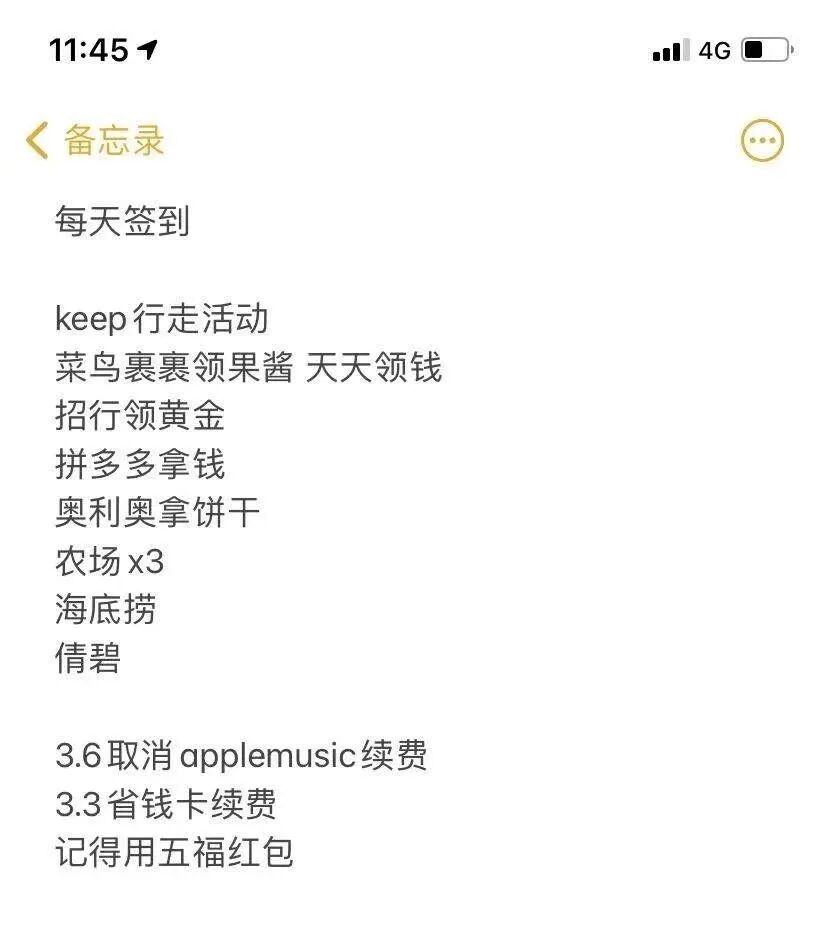 除了抢消费券,我还在京东、淘宝和拼多多上种果树。去招行App上领黄金,Keep上做行走活动,菜鸟裹裹领果酱,奥利奥签到拿饼干,海底捞签到领菜品,还有做倩碧任务领小样。我把这些写在了备忘录里,每天早上醒来后,按着顺序挨个完成,看上去很简单,但所有做完几乎要一个小时。