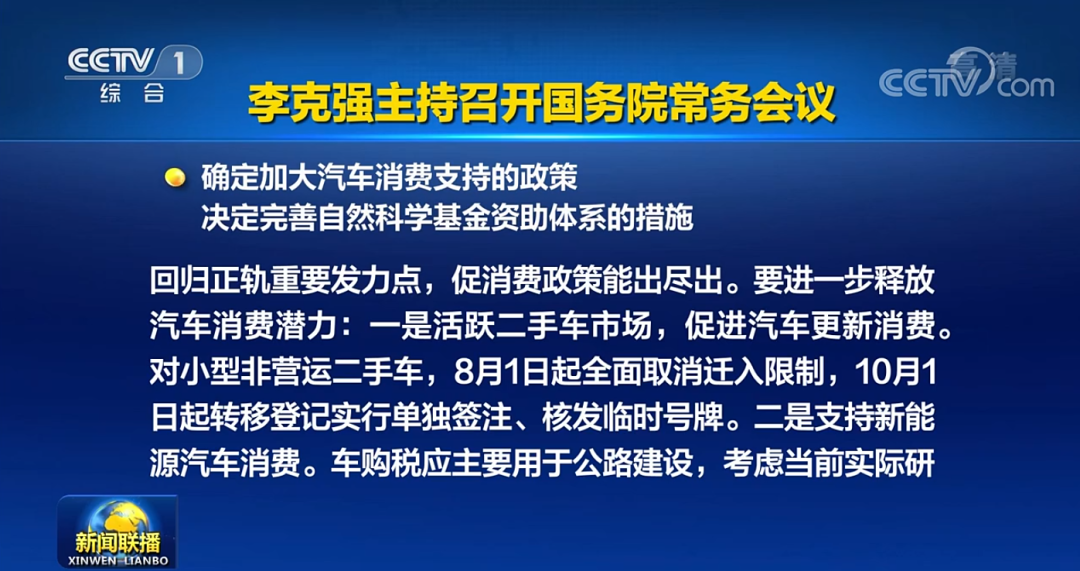 活跃二手车市场,促进汽车更新消费。对小型非营运二手车,8月1日起全面取消迁入限制,10月1日起转移登记实行单独签注、核发临时号牌;