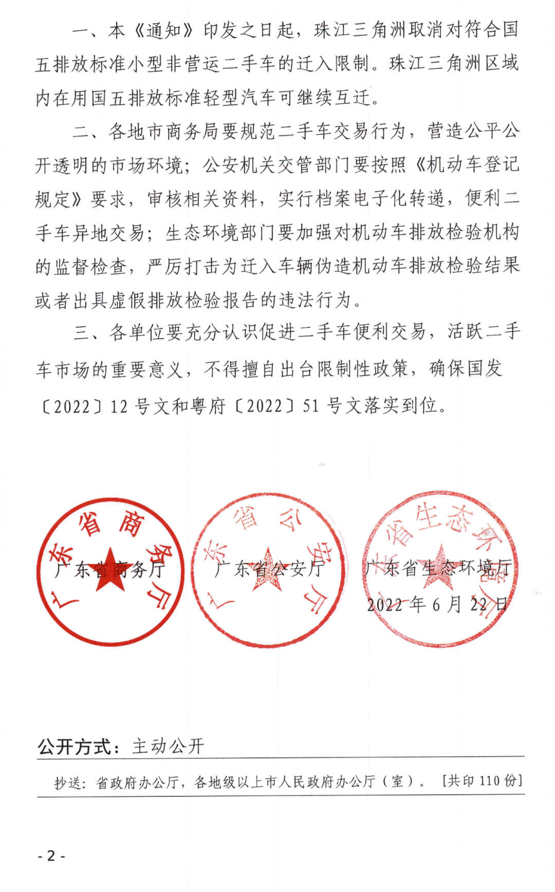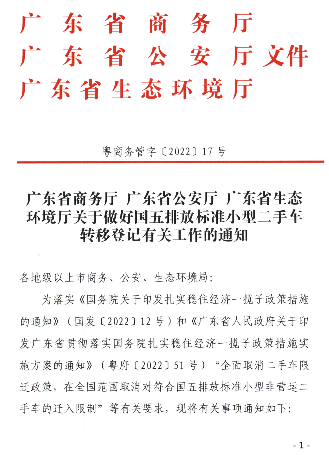 ✦6月22日,广东省发布通知,明确自通知印发之日起,珠江三角洲取消对符合国五排放标准小型非营运二手车的迁入限制。