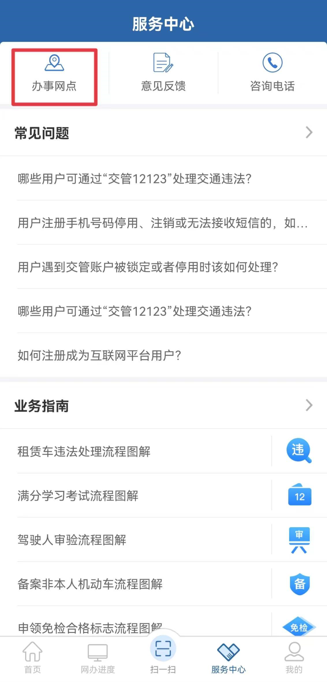 下载并注册登录“交管12123”手机APP,点击下方【服务中心】跳转页面,选择左上角【办事网点】。
