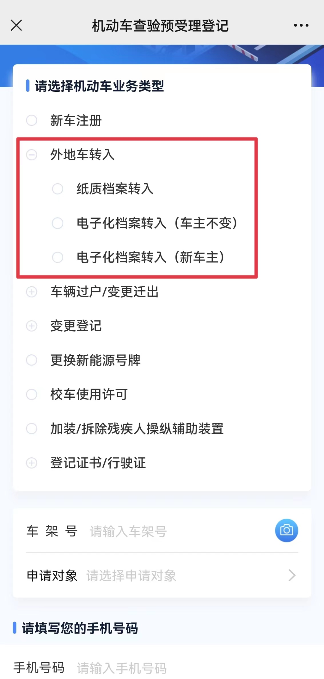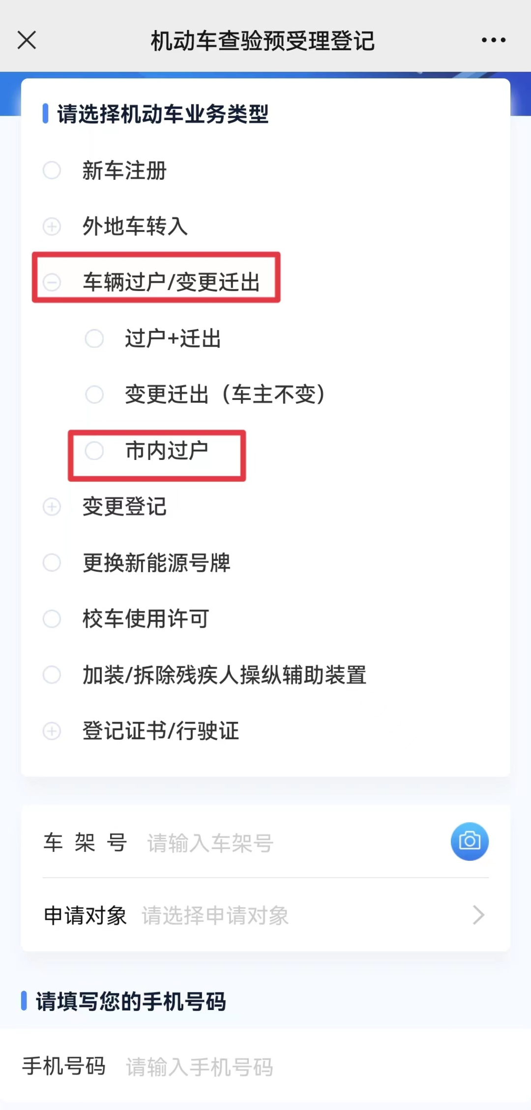 点开【车辆过户/变更迁出】,选择【市内过户】,填写好车架号并完成手机验证后,完善业务信息,即可选择合适的网点和业务办理时间提交预约申请。