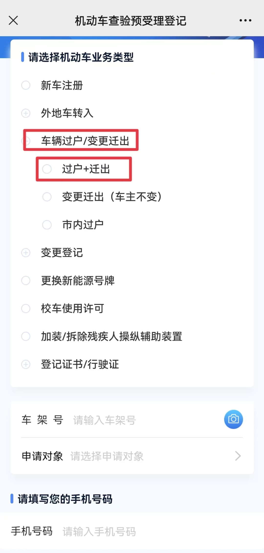 若是在佛山市内的车辆管理所注册登记的机动车需要办理过户并迁出佛山市,可直接选择【车辆过户/变更迁出】中的【过户+迁出】,准确填写相关信息并完成验证后,即可选择网点及业务办理时间提交预约申请。
