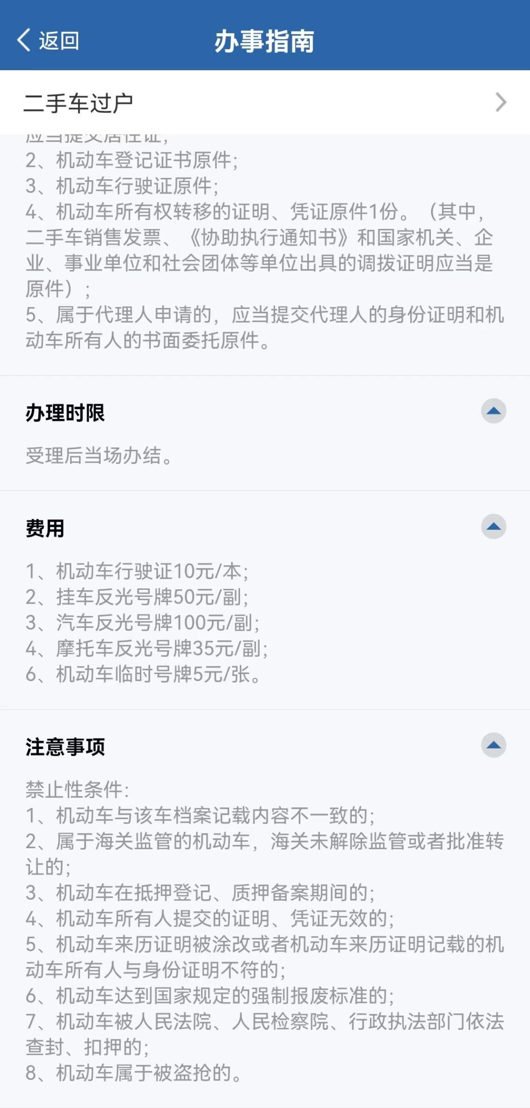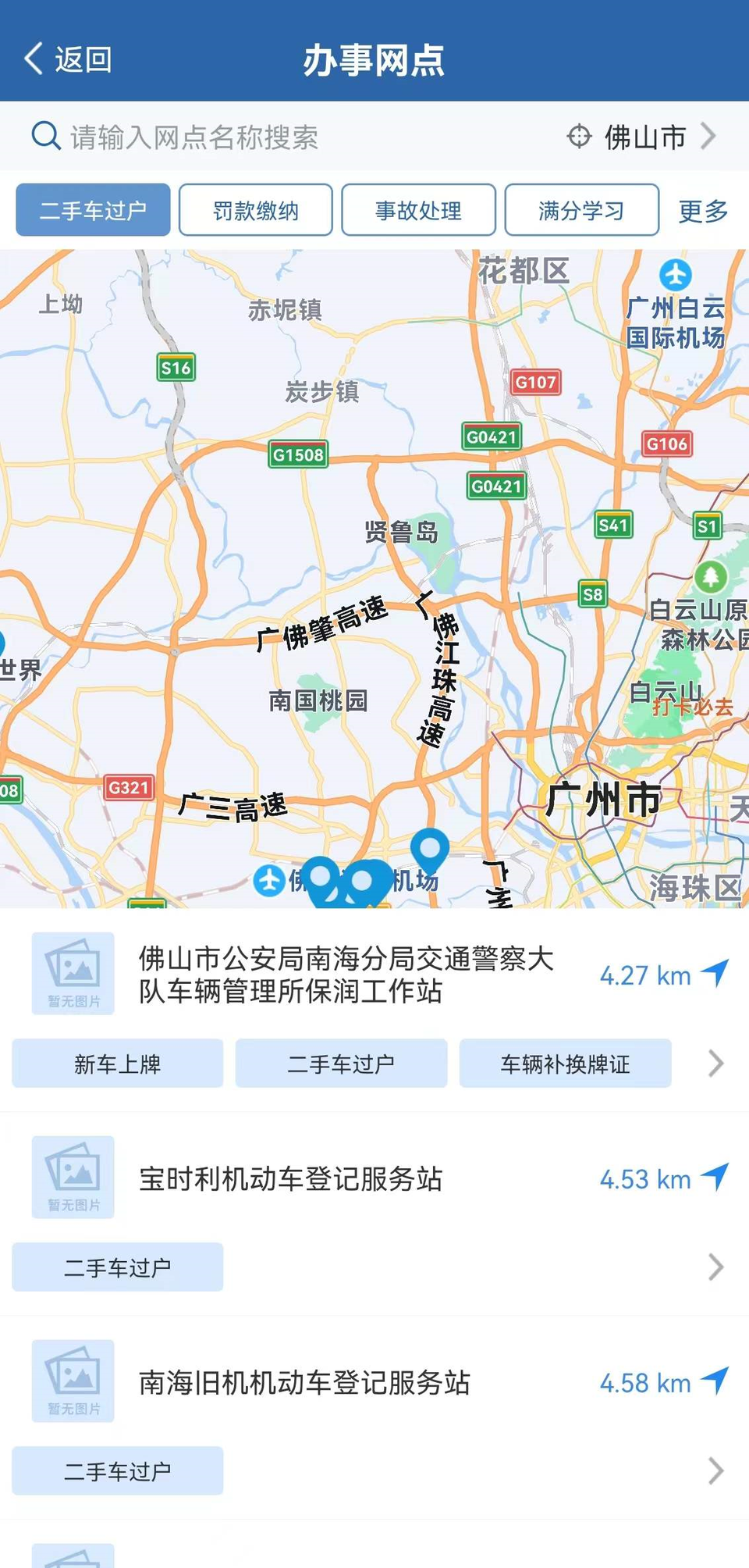 页面跳转后,即可查看佛山全市二手车过户办理网点的地址、服务时间、行政收费、注意事项等信息。