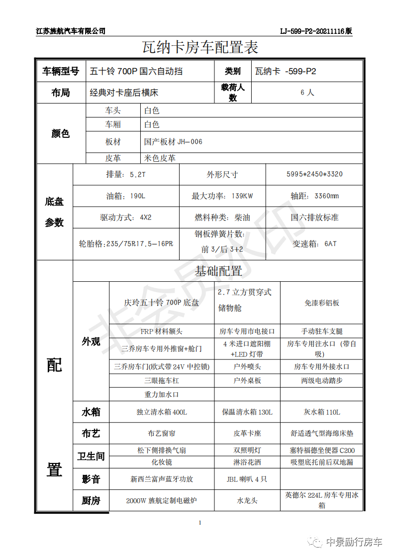 【车型名称】旌航瓦纳卡五十铃700P国六自动挡,六座五卧版