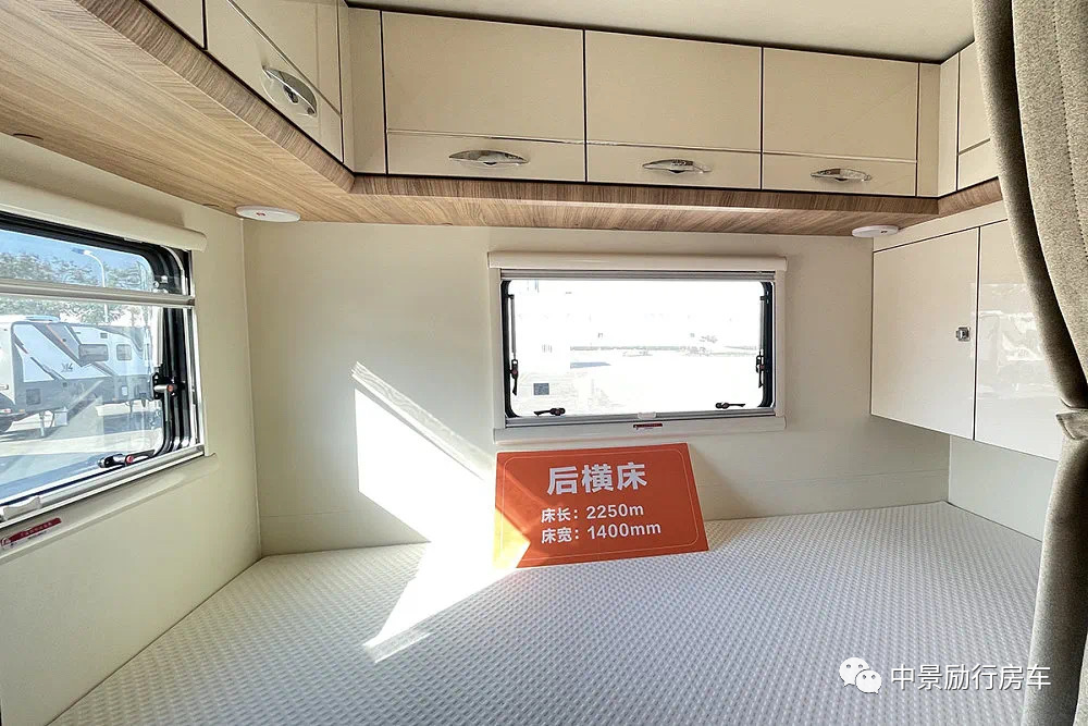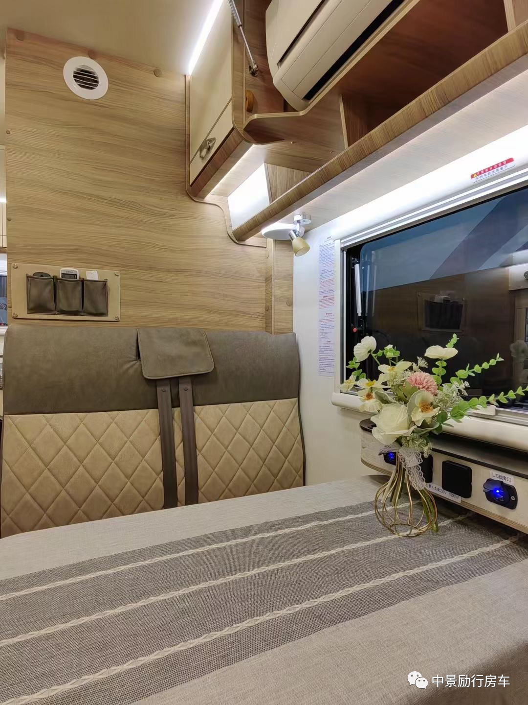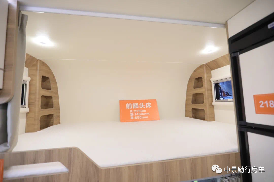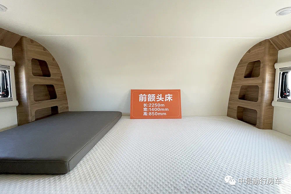 【车内布局】主副驾驶空气座椅,乳胶床垫,额头双人床,车尾双人床,游艇级别防水耐磨地板革,E0级环保家具