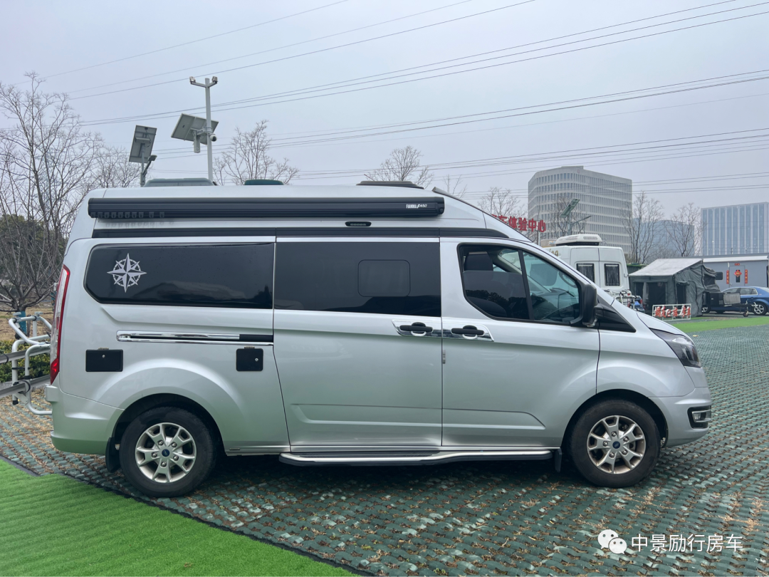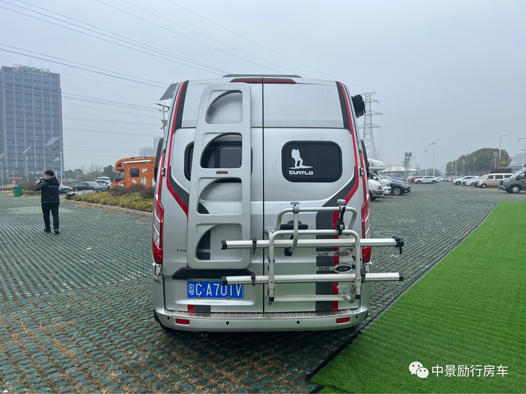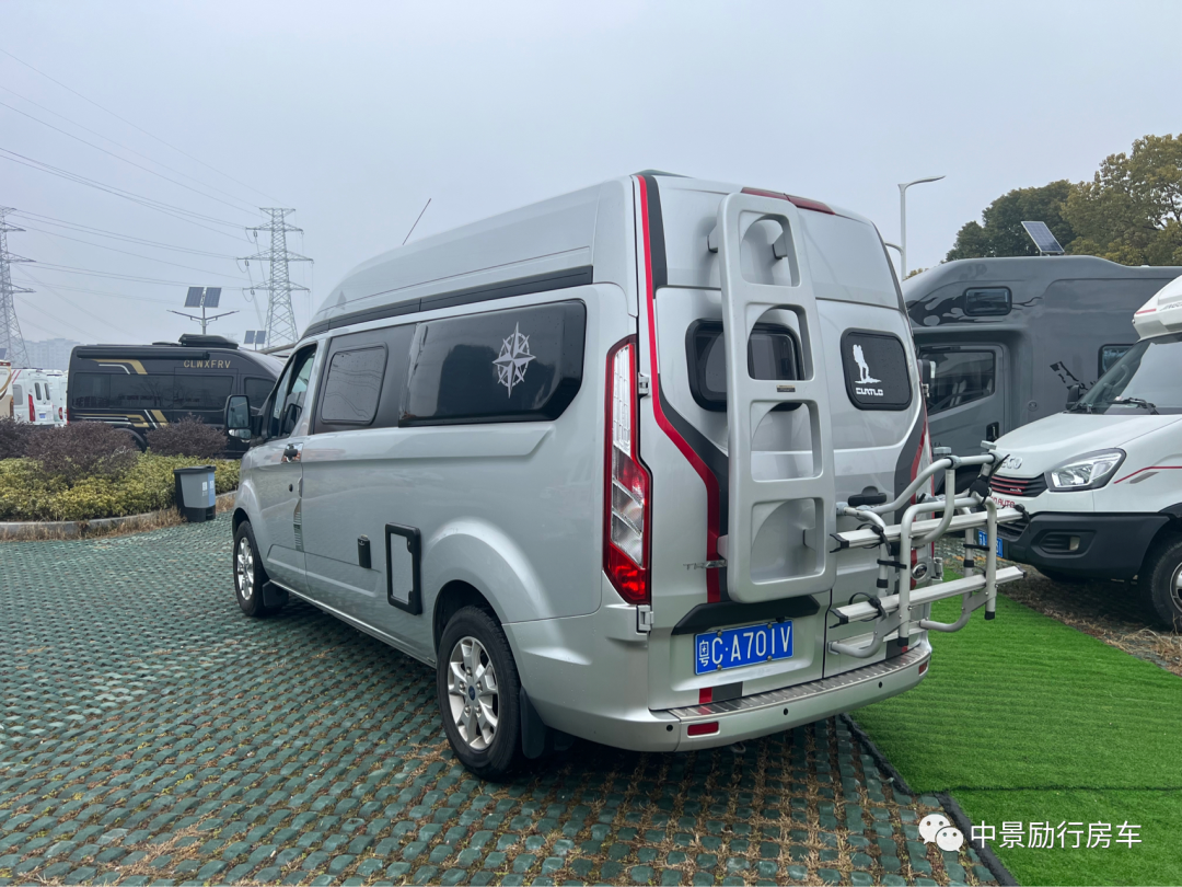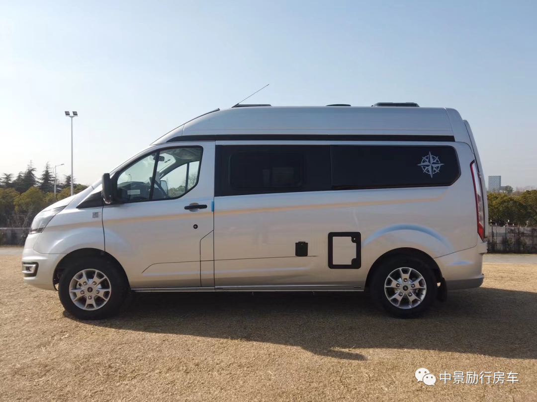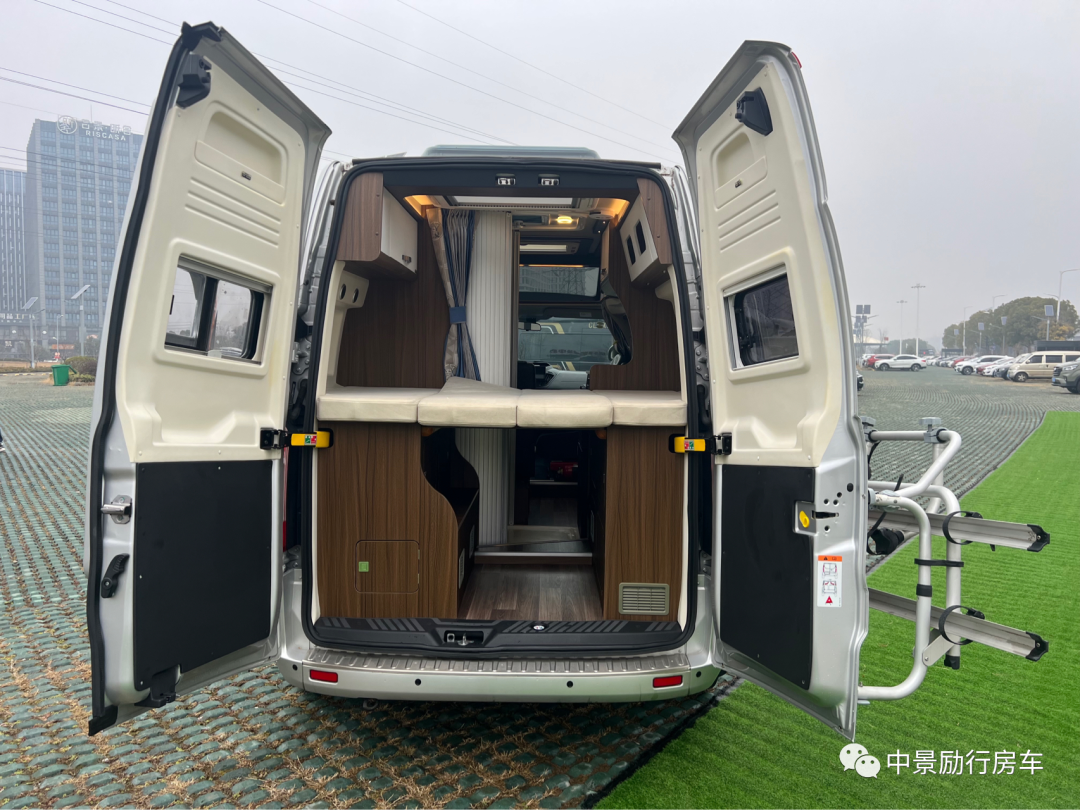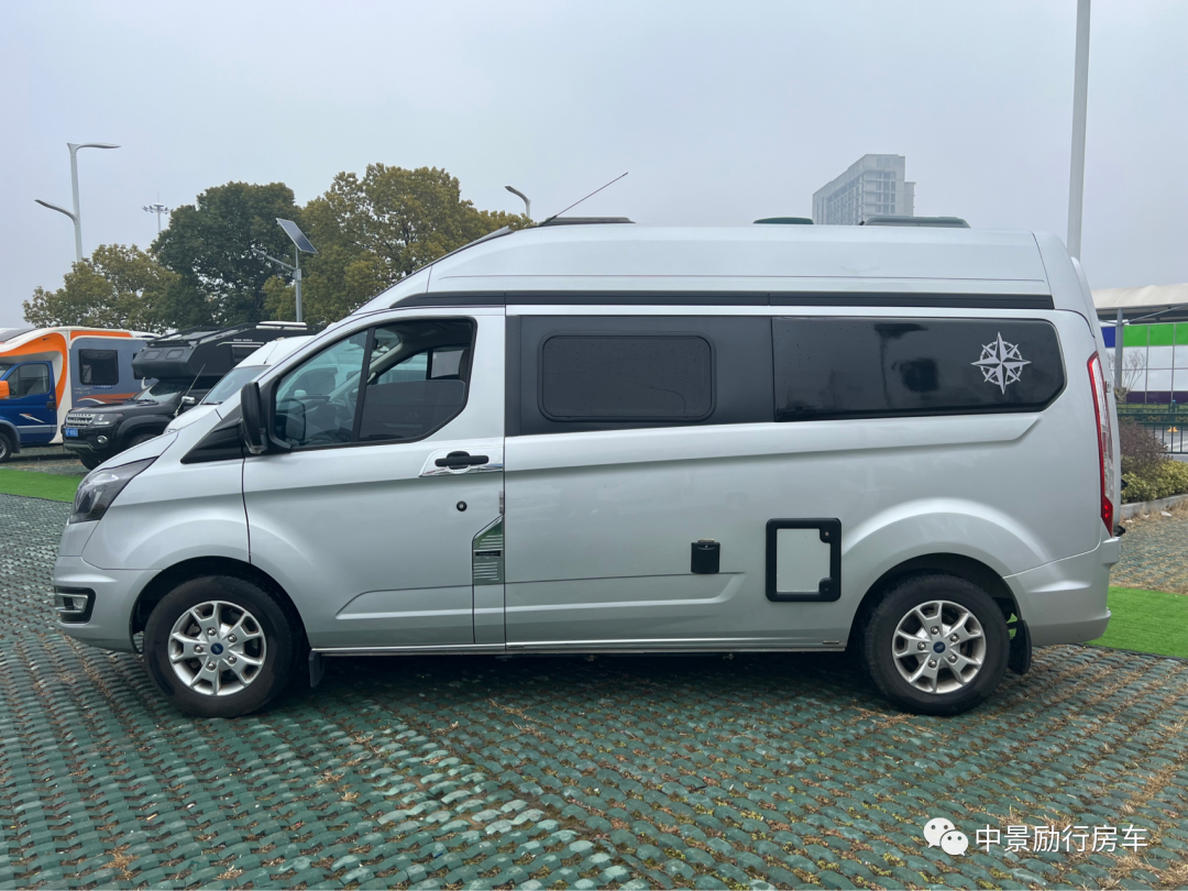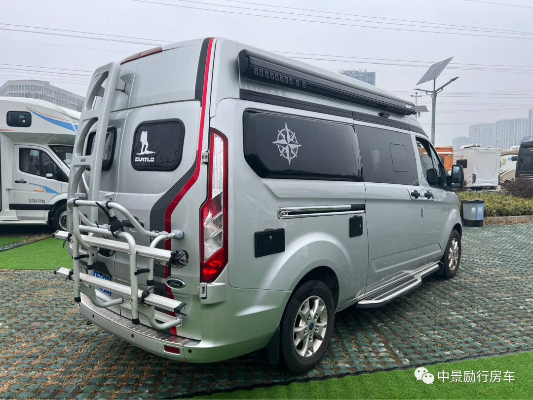 【车外配置】铝合金轮毂罩,城市越野踏板,房车专用户外遮阳棚,双向换气扇,加水口,充电口,外推窗,两侧外拓包,极光银金属漆,车顶三天窗,自行车架,后爬梯