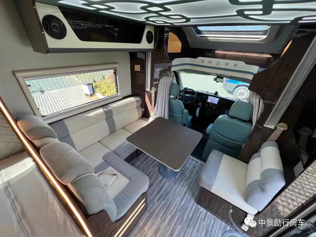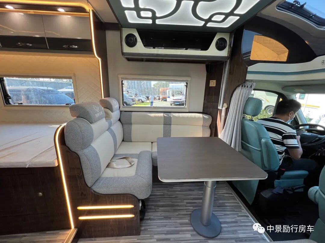 【车内布局】主副驾驶旋转,电动调节升降桌,L型沙发,车尾单人床1950×1000mm,游艇级别防水耐磨地板革,E0级环保家具,电动吊床尺寸2000*1350mm。