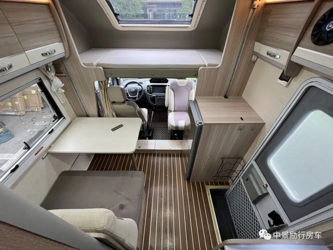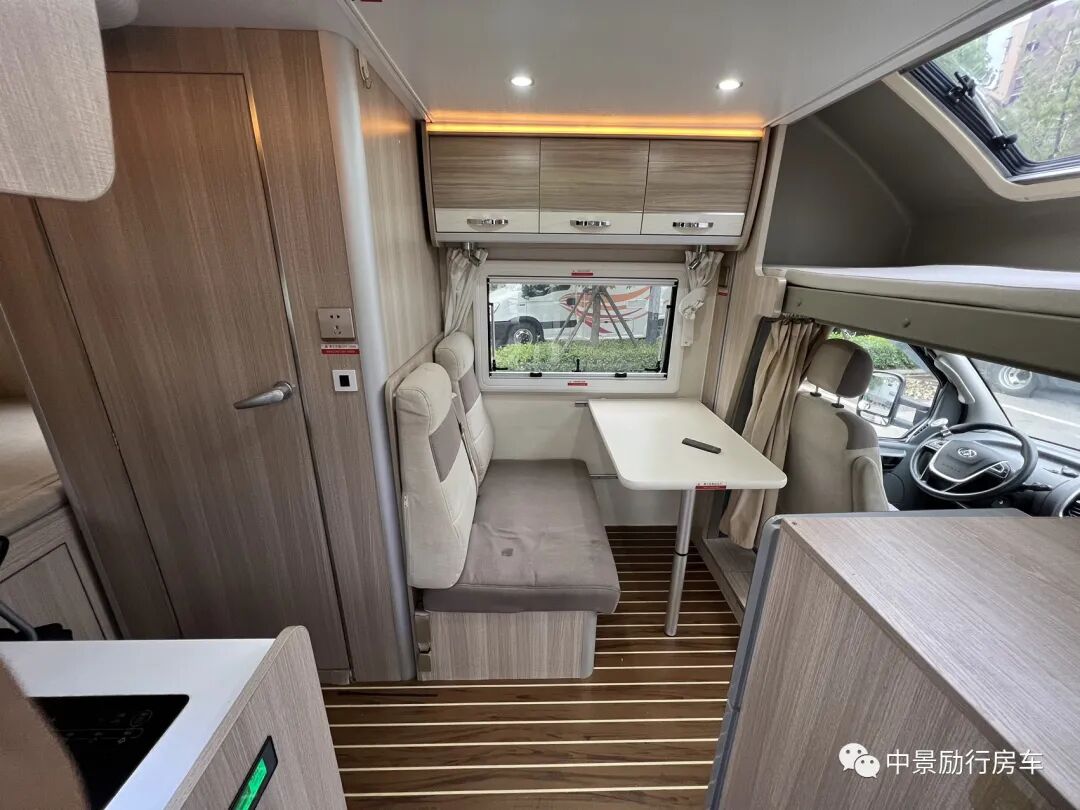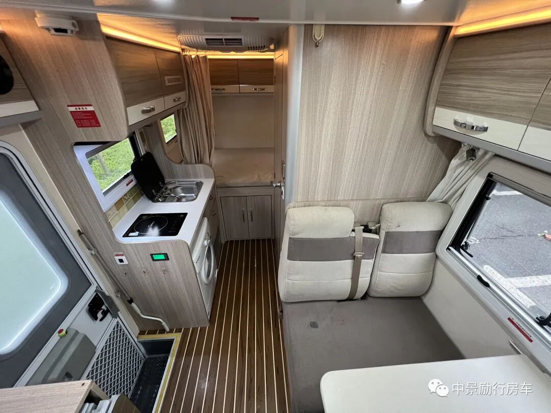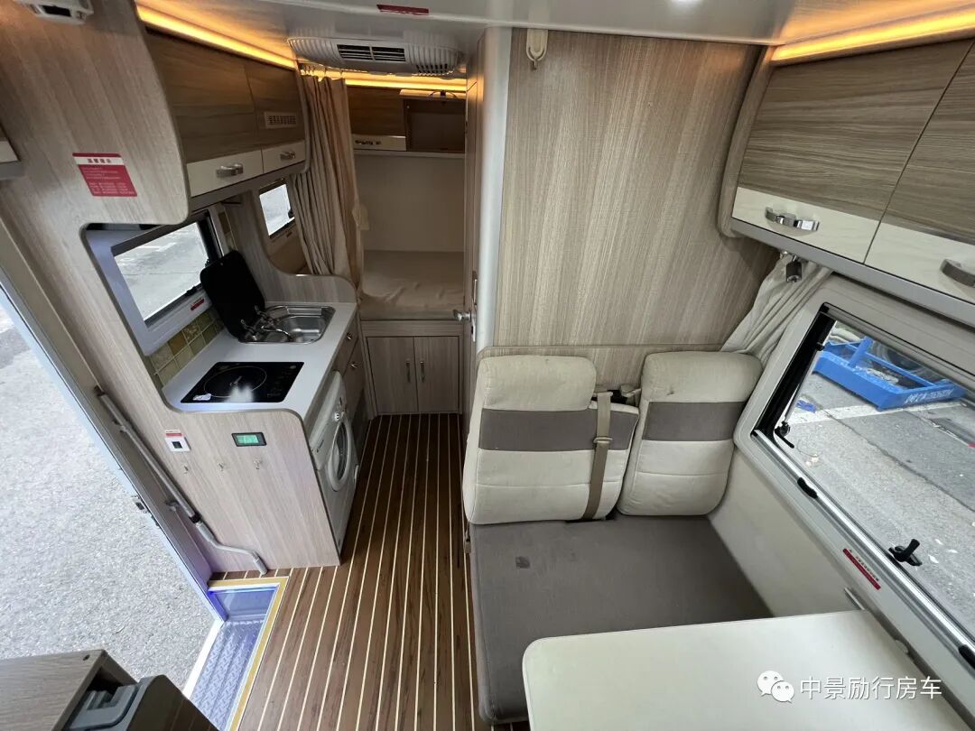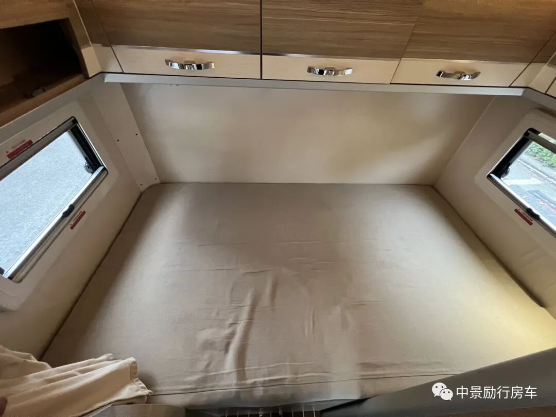 【车内布局】额头电动吊床双人床2000×2000mm,车尾双人床2100×1350mm,游艇级别防水耐磨地板革,E0级环保家具,主副驾驶均可旋转,2300W电磁炉、