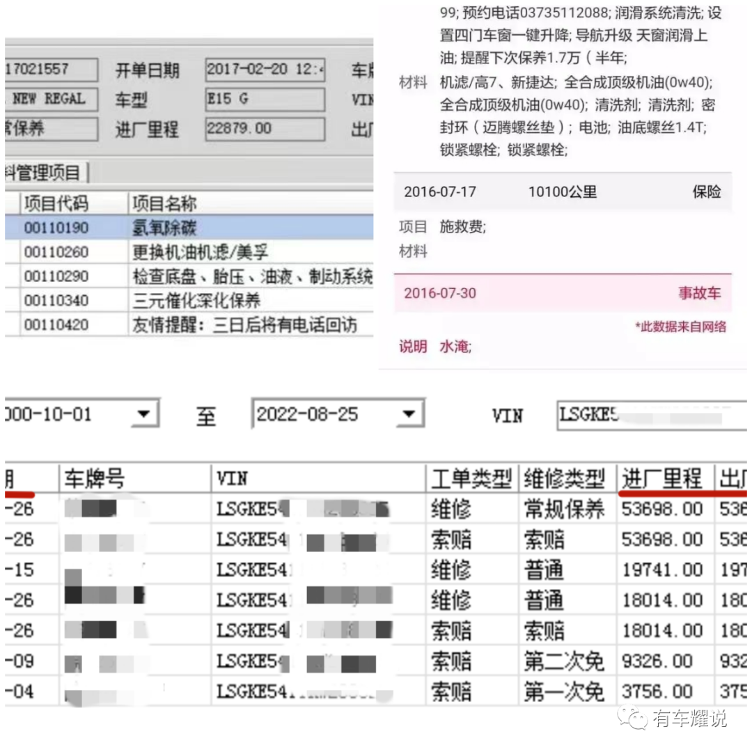 对于记录我们重点要看:①最后一次公里数,推算当前里程,对比是否有调表嫌疑;②内容看不懂,就找关键词:发动机、变速箱、纵梁、气囊、水箱框架、侧围、后围板、钣金、更换等,然后让商家予以解释说明。