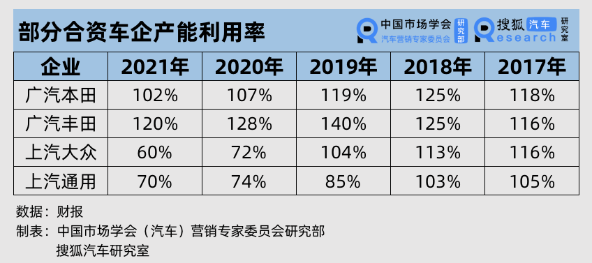 广汽两田能逆势增长与其管理能力不无关系,从广汽集团披露的产能利用率来看,五年间二者的产能利用率均在100%以上,已有产能得到充分释放。而上汽大众、上汽通用由于销量下滑,产能利用率也持续下滑,2021年广汽丰田的产能利用率甚至是上汽大众的两倍,这也是广汽丰田比上汽大众少卖40多万量车依然多赚近13亿的部分原因。