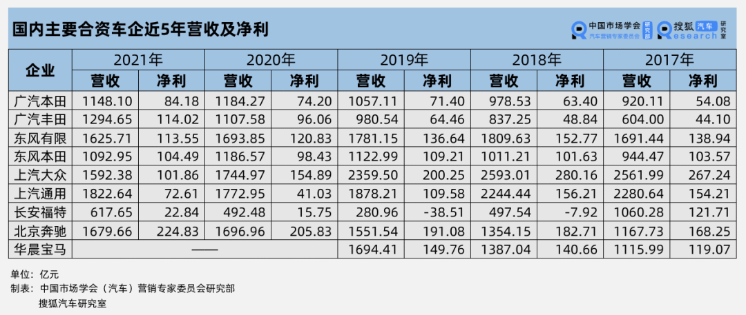 汽车营造社根据各家上市公司财报整理了国内各主要合资车企近5年来的营收及净利润。以上各家车企除北京奔驰外,均为中外双方各持有50%股份。虽然各家公司分配股利的方式有所不同,但均采用权益法计算收益,因此上述合资公司每年对中方企业的贡献约为净利润的50%。