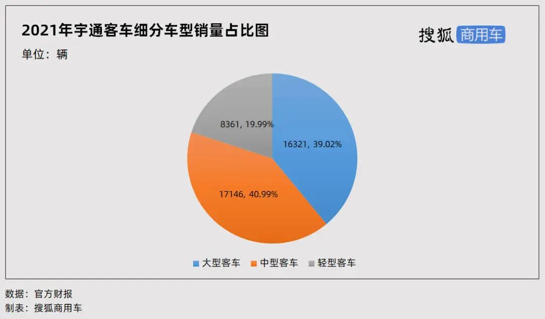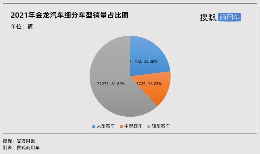 同期,金龙汽车尽管实现了大型客车和中型客车的销量双提升,但大中型客车的合计销量只有19,424辆,相较宇通客车仍有一定差距。不过在轻型客车市场,金龙汽车销量为31,275辆,同比增长17.91%,表现远好于宇通客车。实际上,金龙汽车确实更倚重轻型客车,2021年该车型占到金龙汽车总销量的61.69%,是当之无愧的销售主力。