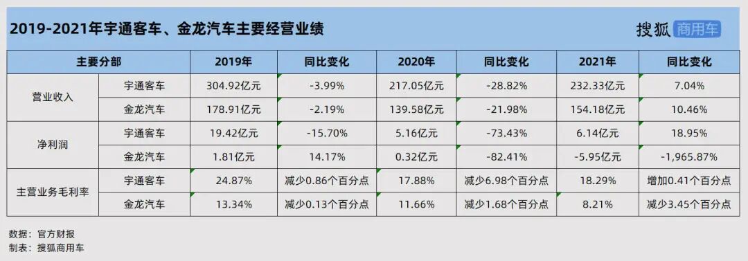 客车市场周期性调整的大背景下,2019-2020年宇通客车和金龙汽车遭遇营业收入和净利润的连续下滑。