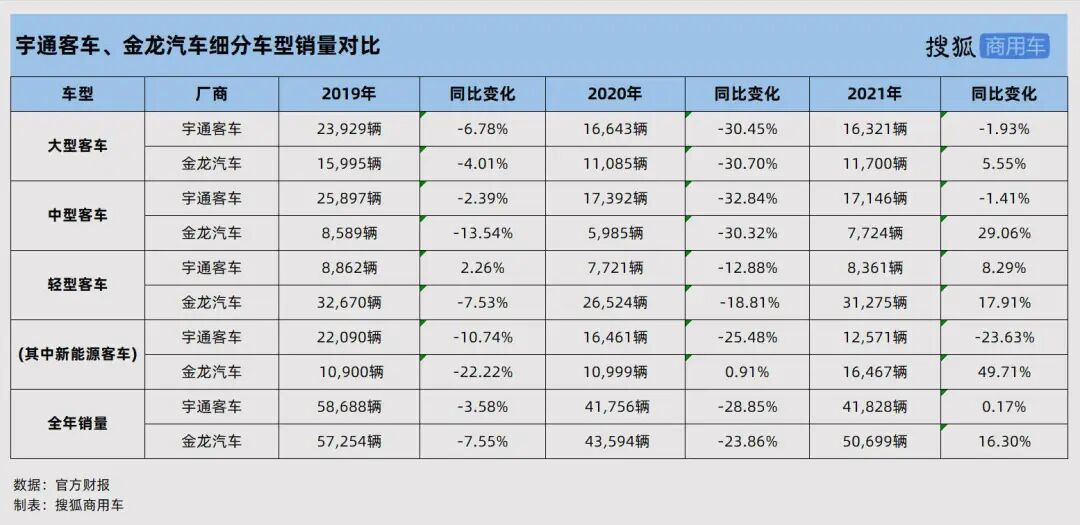 但进入2021年,金龙汽车实现销量反超。官方数据显示,2021年宇通客车共销售新能源客车12,571辆,同比下降23.63%,连续三年遭遇销量下滑;金龙汽车共销售新能源客车16,467辆,同比增长49.71%,连续两年实现销量增长。这样,2021年金龙汽车共比宇通客车多销售3,896辆新能源客车,近三年来首次实现新能源客车销量超过宇通客车。