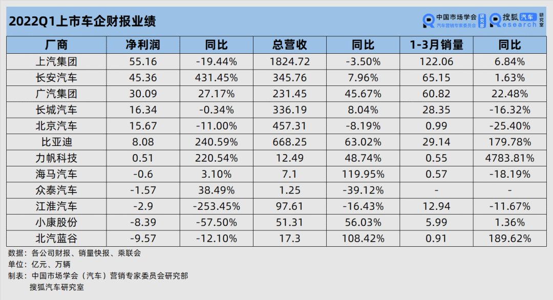 近日,各家上市车企陆续发布了2022年第一季度的财报,从12家公开经营业绩的企业表现来看,整车企业的表现两极分化明显。长安汽车与比亚迪表现较为抢眼,小康股份与北汽蓝谷则表现垫底。