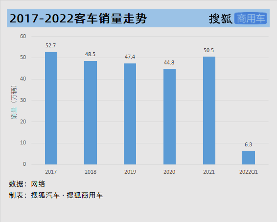 根据终端市场销量统计,客车2022年1-3月终端销售62983辆,同比下滑19.52%。一季度客车销量仅为过去几年全年销量的八分之一左右,如果疫情形势短期内无法好转,2022年中国客车销量可能会面临“冰点”。
