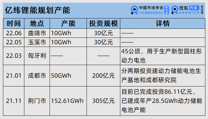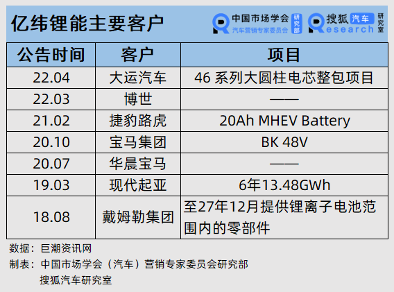 部分得益于与韩企SK的合作,亿纬锂能在乘用车市场的国际客户拓展始终走在前列。下表是汽车咖啡馆根据亿纬锂能的公告整理的其获得定点订单的客户,其中既有豪华品牌,也有知名供应商,但订单内容正逐步从混动系统电池向三元大圆柱电池过渡。