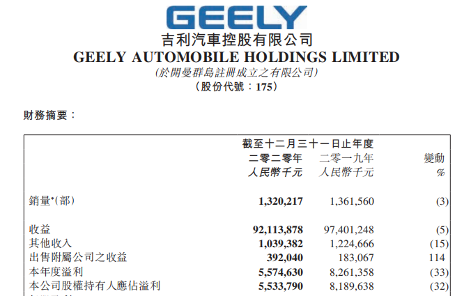 3月23日,吉利汽车控股有限公司(简称“吉利汽车”)(HK.0175)发布2020年未经审核的财务业绩。数据显示,2020年吉利汽车实现营收921.14亿元,同比下滑5%;股东应占溢利55.34亿人民币,同比下滑32%,这一财务表现逊于管理层的预期。
