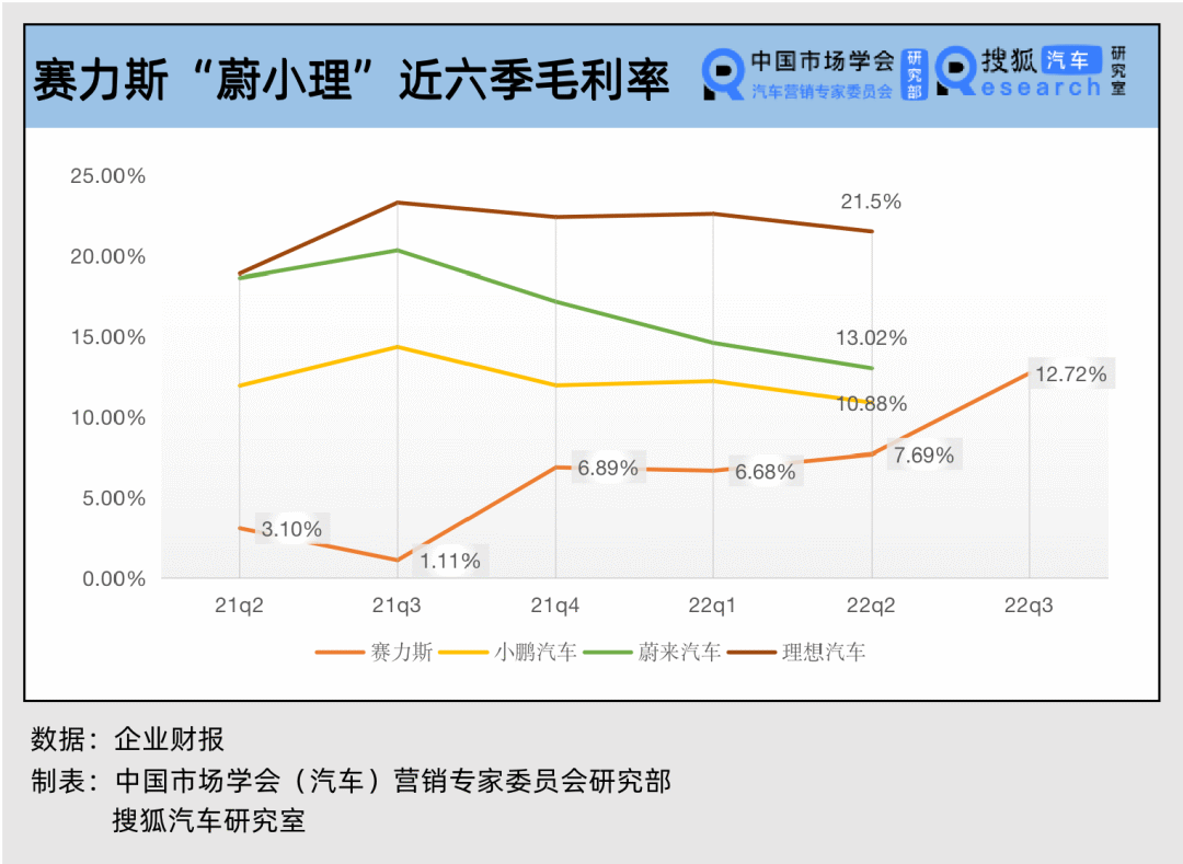赛力斯近13%的毛利率值得关注,这不只是指其自身同环比增速惊人,还包括与行业其他新势力企业对比,水平已经接近。