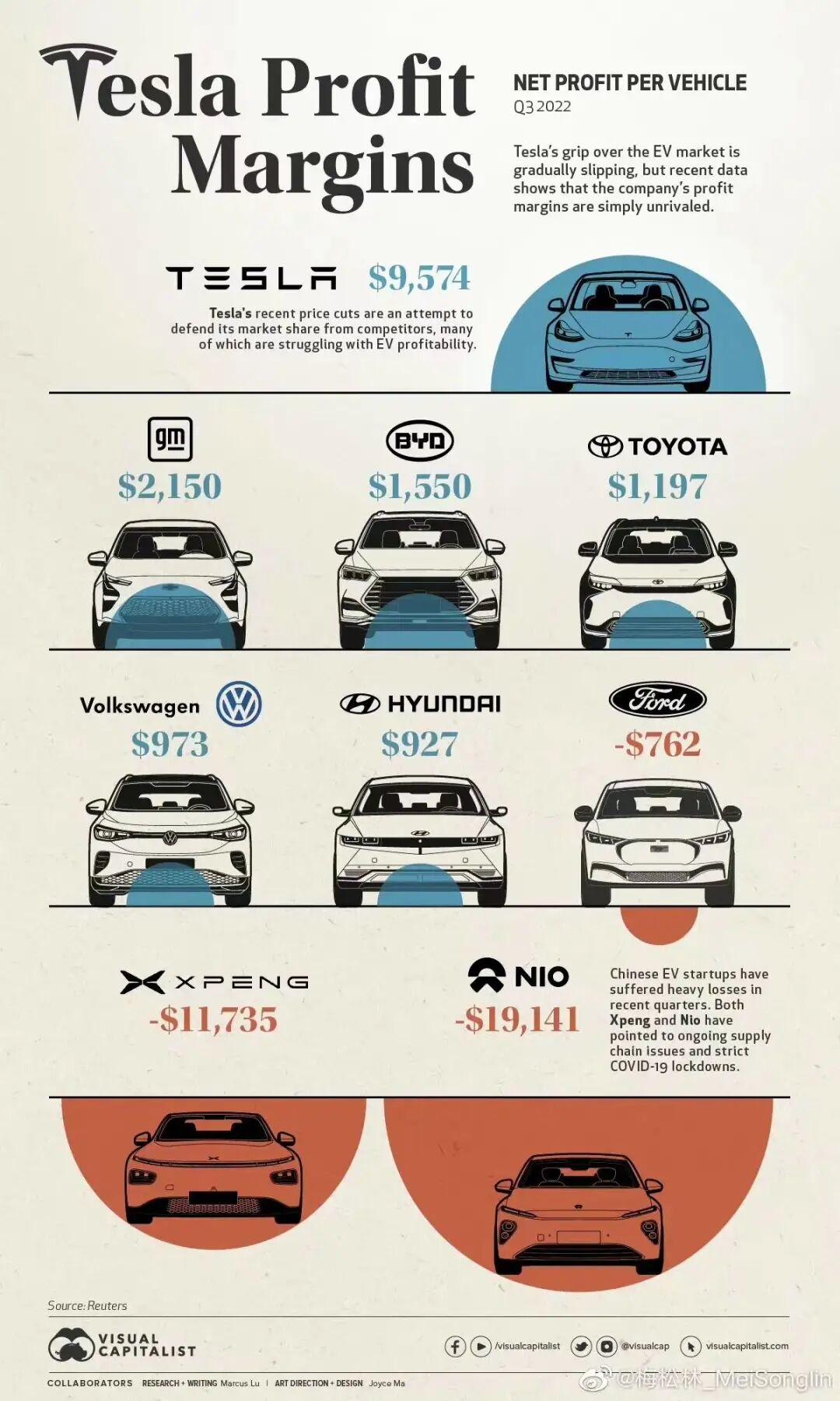 路透社以2022年第三季度财报为基准,统计了全球主流汽车品牌的单车净利润,特斯拉为9574美元最高。作为对比,通用单车净利润2150美元、比亚迪1550美元、丰田1197美元、大众973美元。丰田的单车净利润仅为特斯拉的八分之一。