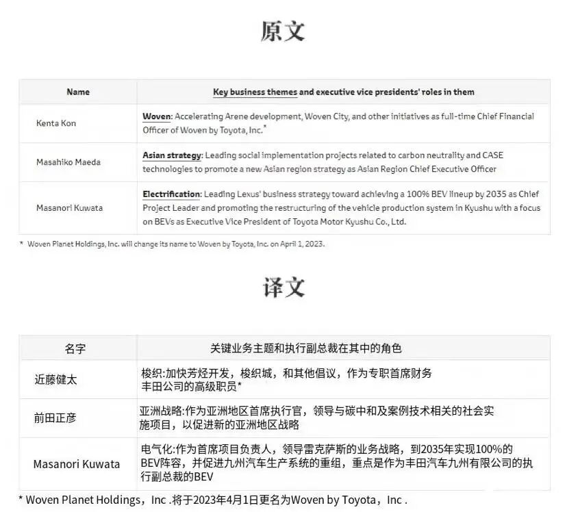 肩负“将丰田全面转型为移动出行公司”的使命,新掌门人佐藤恒治正筹备组建一支新管理团队。2月13日,丰田官网公布了变更后的团队架构。新管理团队形成了三个重点业务支柱:BEV改革、Woven计划以及亚洲碳中和战略。