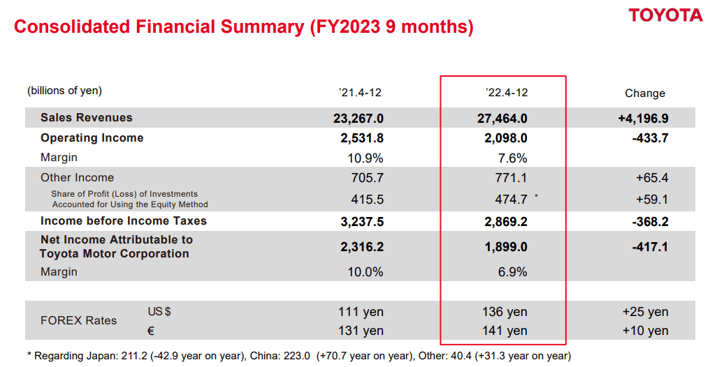 2022财年的第三财季,丰田营业利润出现良性反弹,增长22%至9566亿日元(约72.5亿美元),和2021财年同期基本持平。