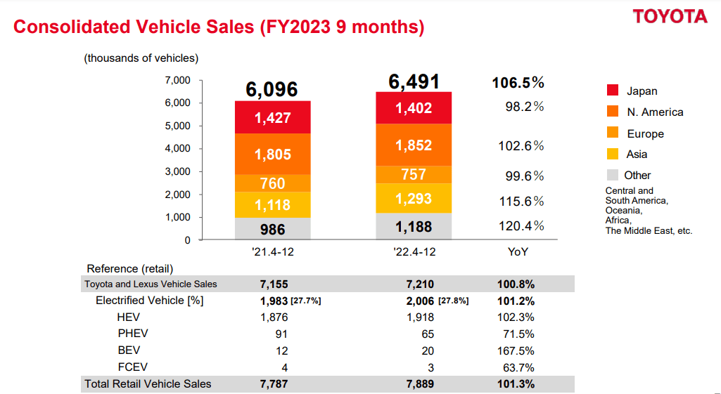 2022财年前三季度,丰田集团销量同比增长6.5%至649.1万辆。从各区域表现来看,由于新车供应无法满足需求,日本市场销量减少1.8%;北美和欧洲市场表现相对平稳;亚洲市场和其他地区逐渐从新冠肺炎的影响中恢复,销量分别增长15.6%和20.4%。