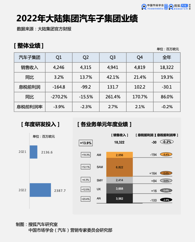 而不赚钱业务,是自动驾驶单元AM及车联网单元AN。从业绩来看,AM2022年息税前利润亏损1.94亿欧元,利润率为-0.4%,AN息税前利润亏损1亿欧元,利润率为-2.8%。