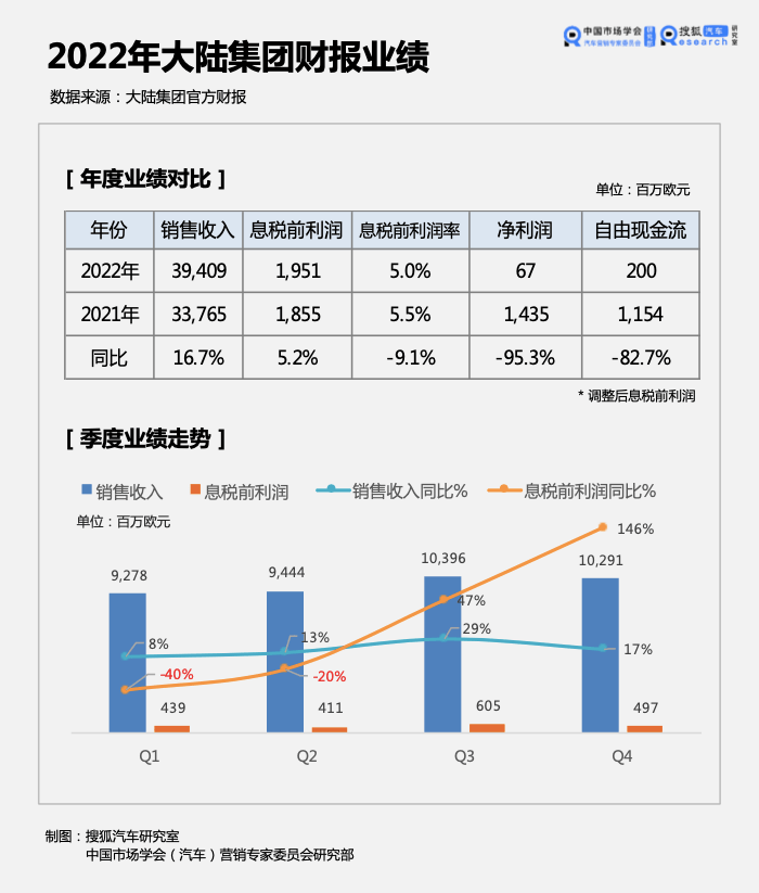 据财报数据,2022年大陆集团销售额为394亿欧元,同比增长16.7%,调整后的息税前利润为19.5亿欧元,同比增长5.2%,调整后的息税前利润率为5.0%,净利润为6700万欧元。