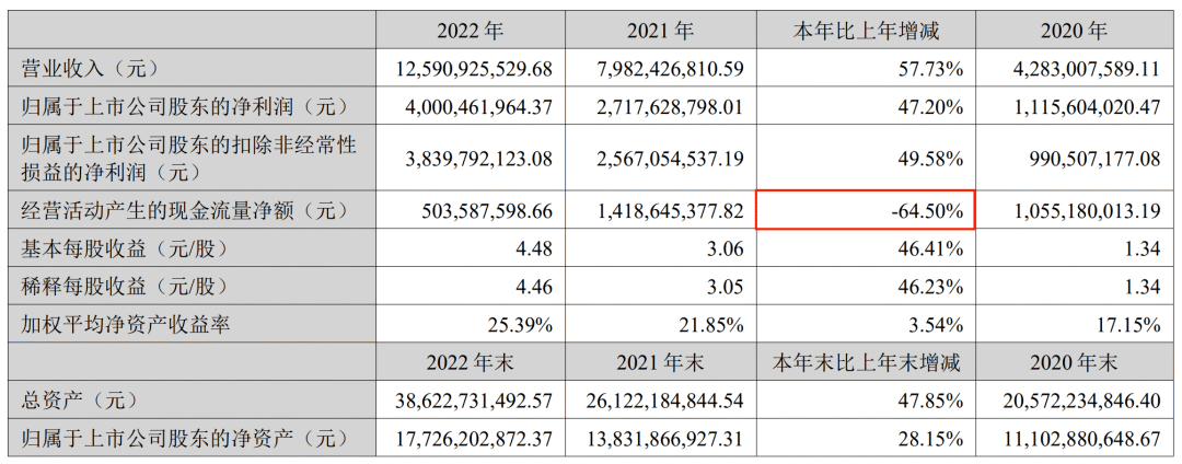 在现金流方面,恩捷股份的2022年经营活动产生的现金流净额仅为5.03亿元,同比下降了64.5%。