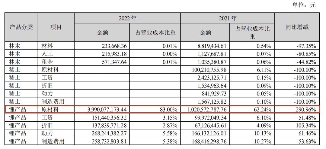 从营业成本来看,2022年,盛新锂能总体营业成本为52.44亿元,其中83%左右为锂产品原材料成本。