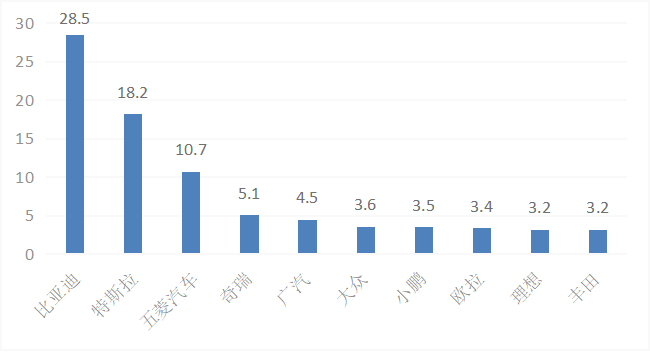 据CINNO Research数据,今年一季度,新能源乘用车批发销量为119万辆,份额提升至21.9%;前十大品牌以传统车企为主,比亚迪和特斯拉仍是电动车扛把子,期内销量分别为28.5万台和18.2万台,合计占比接近40%;五菱汽车销量为10.7万台,位居十大品牌榜第三。