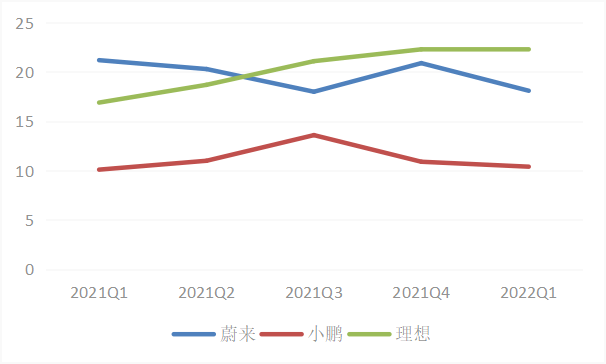以今年一季度的整车毛利率来看,理想为22.4%,同比增长5.5个百分点,高出蔚来4.3百分点,更是远超小鹏12个百分点,而蔚来、小鹏同比均有不同程度下降,尤其是蔚来,下降超过3个百分点,在最近几个季度内处于低位。