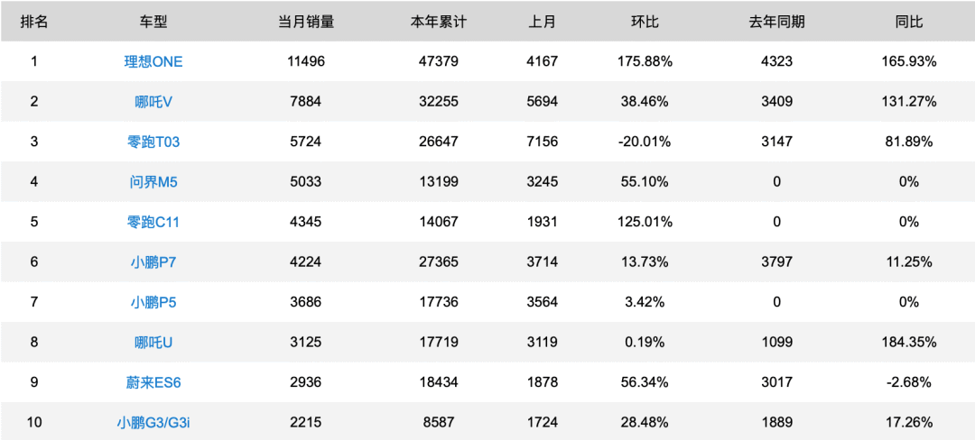 单看造车新势力品牌,“蔚小理”的领先地位也不断受到挑战。乘联会发布的5月销量数据显示,2022年5月新能源汽车销量-造车新势力车型销量排行榜中,理想ONE销量为11496辆, 位居第一,较去年同期上涨165.93%。哪吒V以7884辆的销量位居第二,较去年同期上涨131.27%,本年累计销量达32255辆。5月零跑T03销量5724辆,排名第三,较去年同期上涨81.89%,本年累计销量达26647辆。