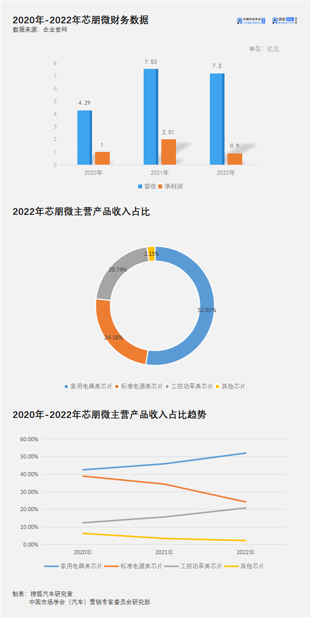 财务数据显示,2022年全年芯朋微营收7.2亿元,2021年营收是7.53亿元,同比下降4.46%;2022年净利润0.9亿元,2021年为2.01亿元,同比下降55.36%。
