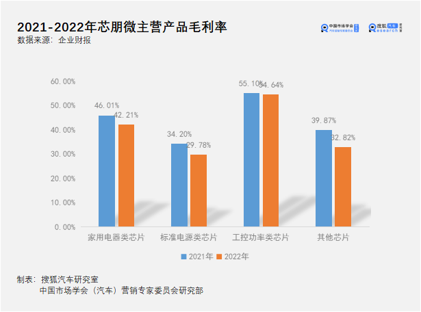 对于营收和净利润的下滑,芯朋微给出的原因是,集成电路整体下行阶段,出货量减少。根据CINNO Research 数据,2022 年中国市场智能机的销量约为2.86亿台,同比下降13.2%;根据奥维云网(AVC)推总数据显示,2022年中国家电市场零售额规模为7081亿元,同比下降7.4%。而手机和家电的芯朋微半导体产品的主要终端载体,约占总收入的76%。