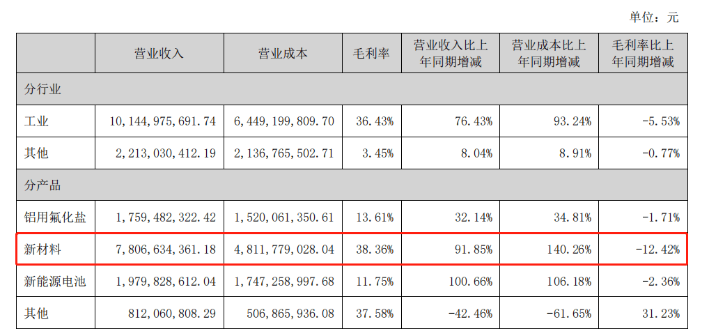 受整体下游市场需求量增长,因此多氟多产品销量增长明显。但上游原材料价格增长带来的成本压力也让多氟多的利润被一再压缩。