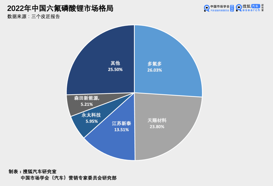其中,六氟磷酸锂是目前商业化应用最广泛的电解质材料,也是是锂电池电解液最重要的组成部分。2022年,多氟多六氟磷酸锂产品的国内市场份额为26.03%,排名第一。