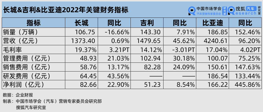 对比吉利、比亚迪的财报,长城虽然销量最低且同比下滑,但毛利率是三家中最高的;比吉利少卖了37万辆,营收仅相差106万元,净利比吉利多了31亿元,且三大费用的成本控制更好。然而,面对行业冠军比亚迪的强势崛起,曾经走在前面的长城、吉利确实被甩开了身位。