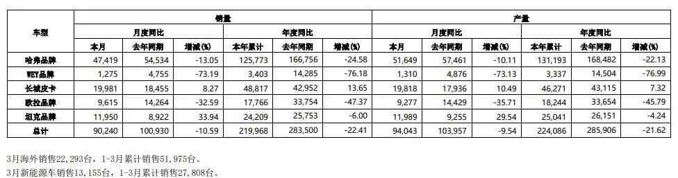 国信证券还指出,虽然3月长城汽车销量同比增速仍为负,但降幅已较前两月显著缩窄。
