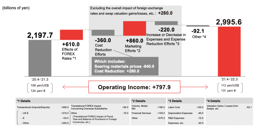 以丰田为例,汇率影响、营销促进市场规模扩大、金融服务等增加了利润,销售成本、劳动力成本、折旧成本及研发开支等,导致了利润的缩减,正负影响相互抵消后,实现2021财年营业利润2.99万亿日元。本田、日产财报中,也对这一过程有所说明。这样的阐述在欧美及中国企业的财报中并不常见,足见日企对成本控制的重视。