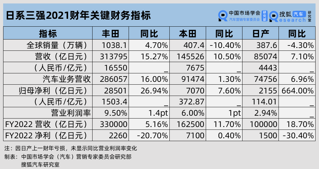 近日,日系三强发布2021年财报,在成本上涨、供应链紧张的大环境下,丰田、本田、日产依然实现营收、净利双增长,韧性凸显。但基于对环境的考量,三家日企的下一财年预期并不乐观,丰田、日产均预测净利大幅下滑,本田也仅预测微增0.4%。