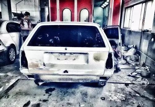 过完户立马送到了修理厂,拆成了一块铁皮,颜色早就选好了,绿油油的: