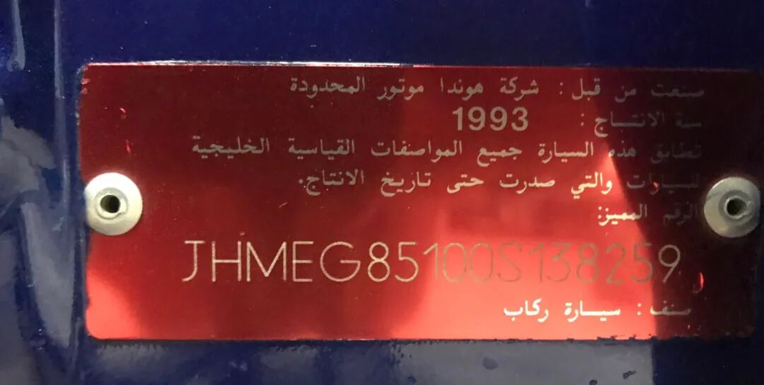 但是我们国内是有正规手续的五代思域的,那就是EG8。也只有EG8正规进口过,它有两种类型,一是进口来的亚洲版,估计是中东来的,铭牌上印着这个不知道甚么鬼的屌文: