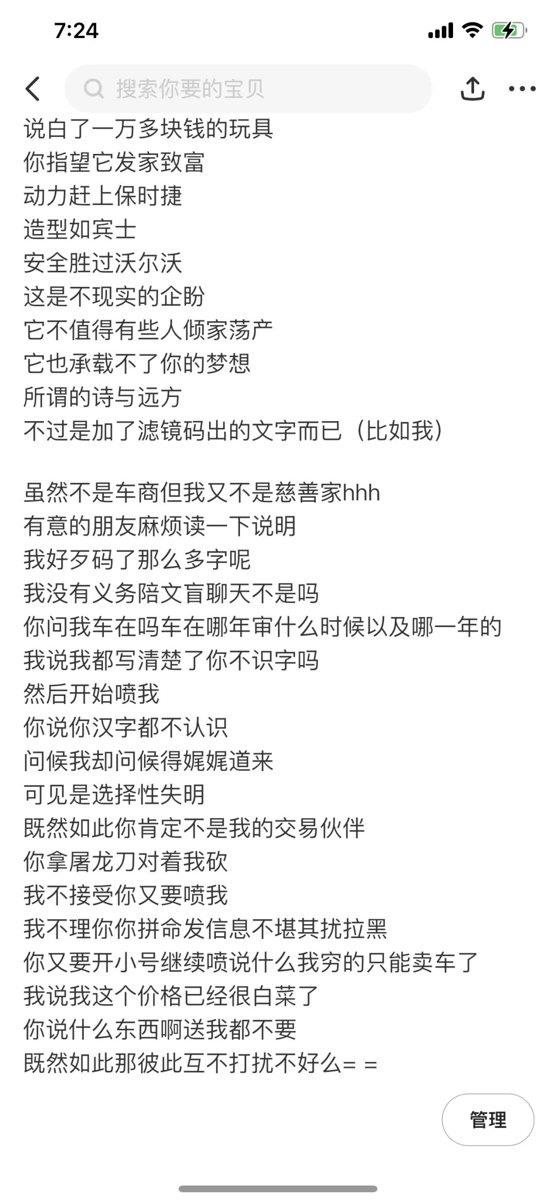 在询问我的这89人当中还有起码一半是“文盲党”,这和那些连文章标题都不看在我订阅号留言区“盲评”的人没有区别。明明在物品描述里面把车子什么情况,年审费用到何时,几把钥匙,表显多少公里写得清清楚楚,但起码有44人就上述问题反复询问,还有更离谱的是标题就写了这车是哪一年的,还有人问“这车哪一年的?”